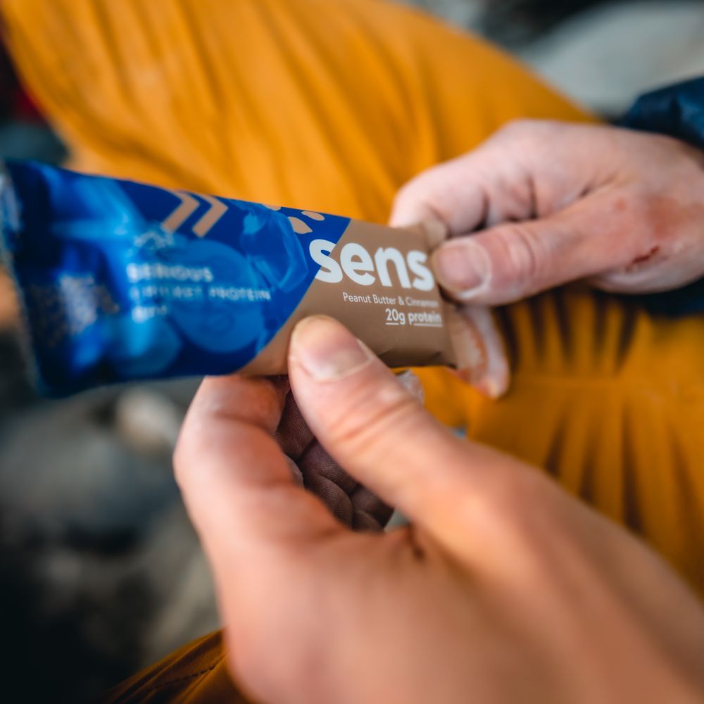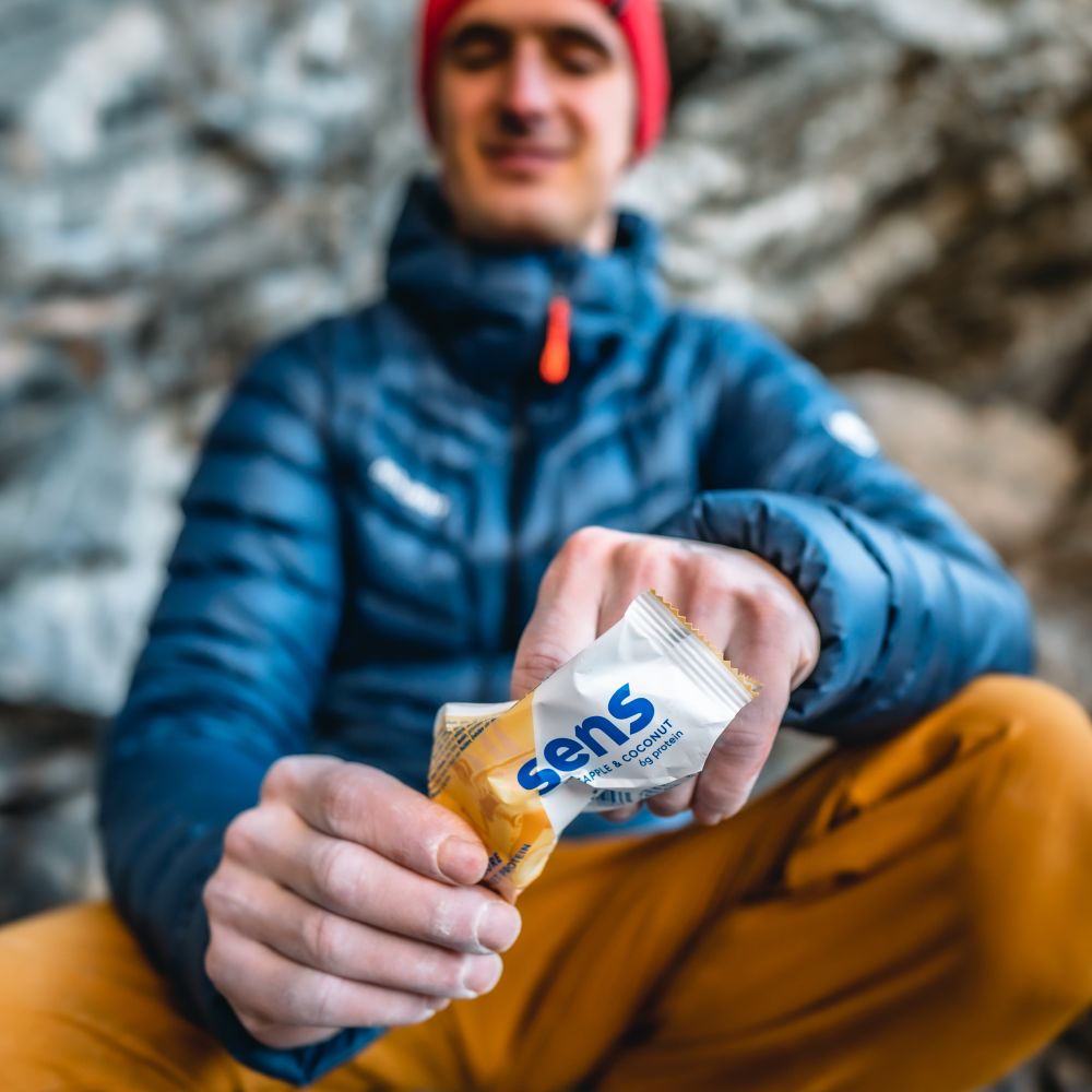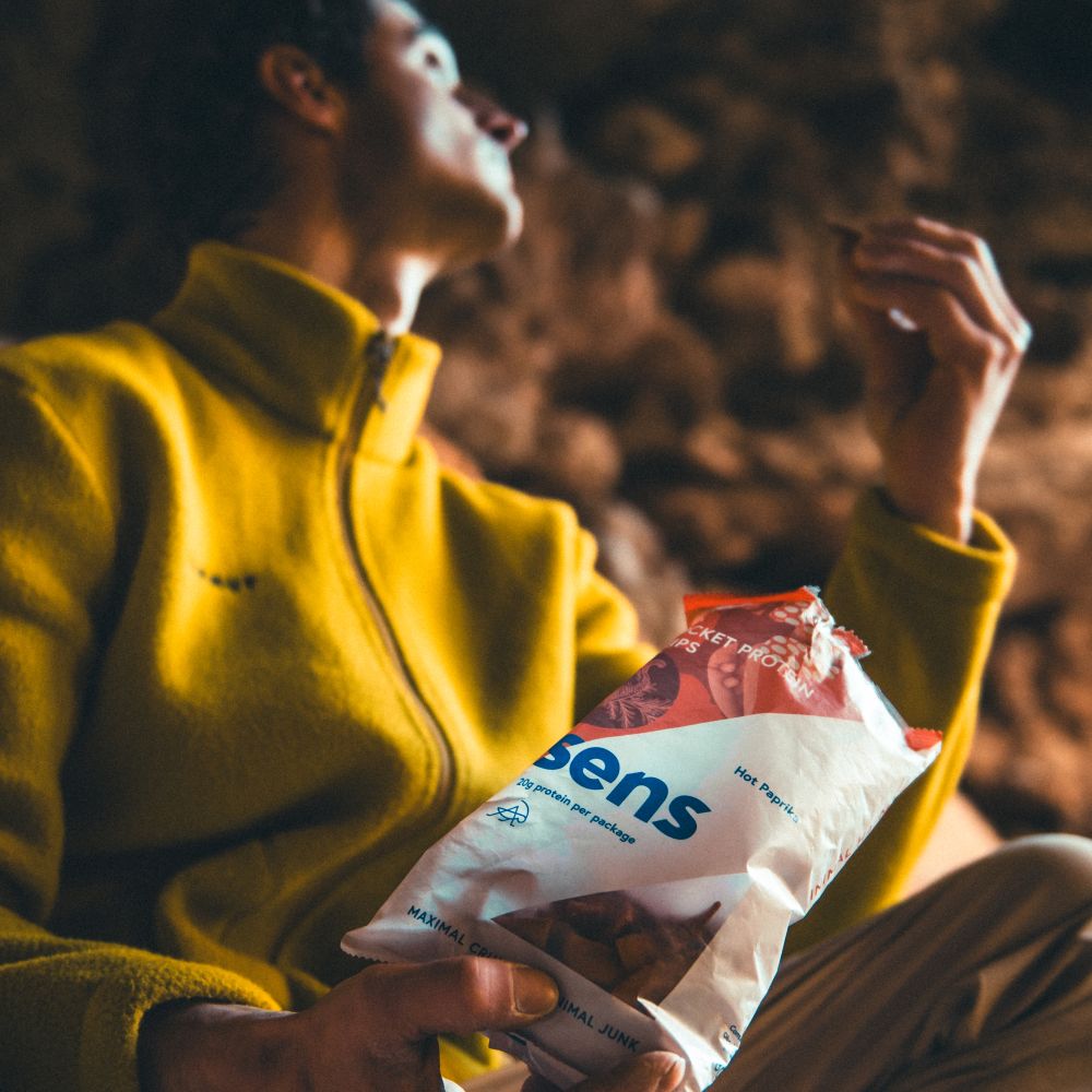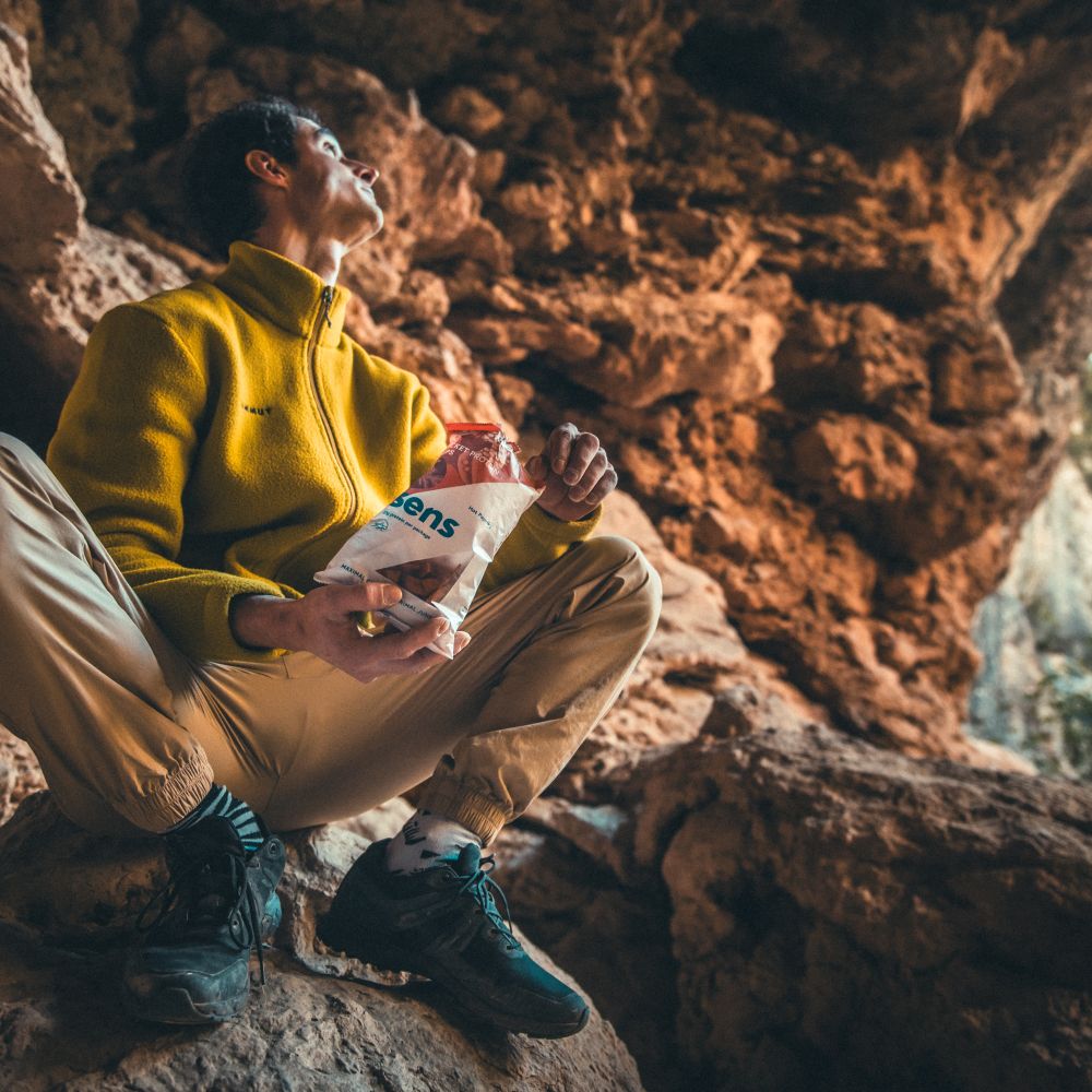 I enjoy crickets mainly in the form of high-quality protein bars, which have 20 grams of protein per bar and are an ideal snack for me wherever I go. For a full day in the rocks, a long road trip in the car, or a multi-phase training in the climbing gym. And then there's the protein blend in two flavors, which is fine for several reasons. It's great as a first meal after a hard climb, or it's a proper snack or breakfast before a workout, power-endurance climbing or hard training session.